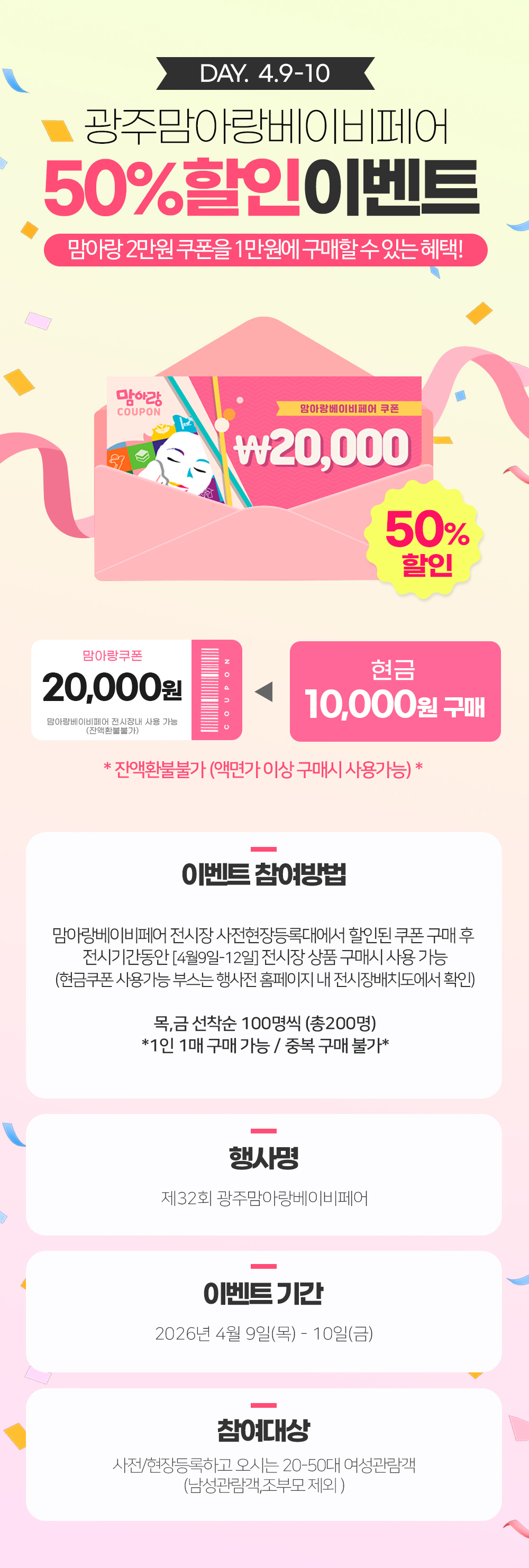 4.9(¸ñ)10(±Ý) 2Àϰ£ ¼±Âø¼ø 100¸í(ÃÑ200¸í) 2¸¸¿øÄíÆù 50% ÇÒÀÎ À̺¥Æ®